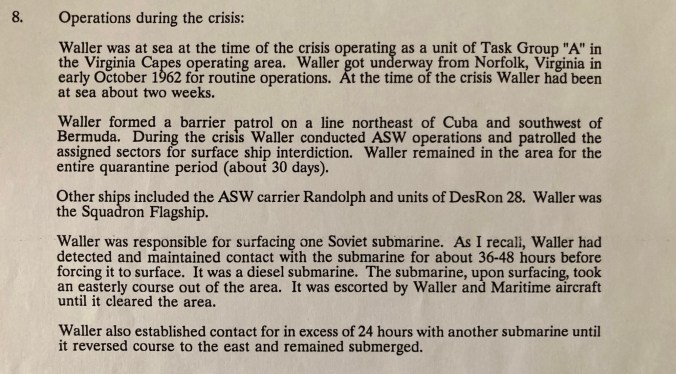 And “ASW”? That’s anti-submarine warfare. The Waller and other U.S. Navy warships were intercepting and tracking Russian submarines, and now the situation was coming to a head. More on that below.