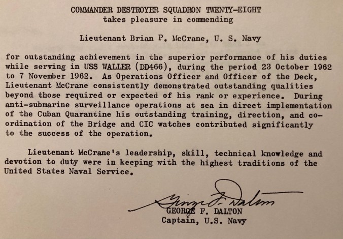 During the Crisis, my friend Brian McCrane (Annapolis ’53) was an officer aboard the Waller, which was assigned to the U.S. Navy task force that created a quarantine zone around Cuba to prevent Russian vessels from reaching the small island. After Brian passed in 2018, his oldest daughter Denise (and one of my dearest friends) gave me several albums she had assembled for him, containing records and mementoes of his service in the Navy. One of these albums is devoted to Brian’s service on the Waller, covering the period of the Cuban Missile Crisis. Reading through it recently, I understood that this was a bit of living history.
