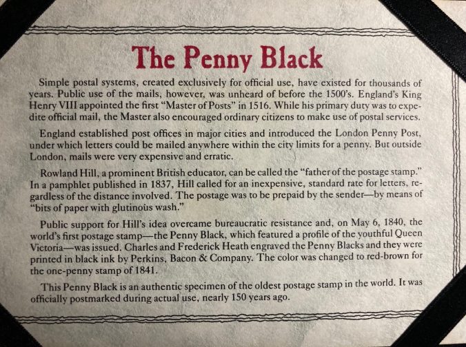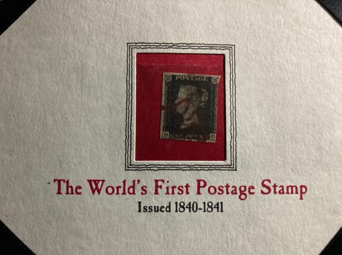 In addition, some postage stamps constitute historical markers in and of themselves. I offer as a prime example the Penny Black, the world’s first postage stamp, printed in England during 1840-41. As mail service became an increasingly important part of English life and commerce, a British educator named Rowland Hill proposed an easy way of paying for postage, by using bits of printed paper that could be affixed to envelopes.
